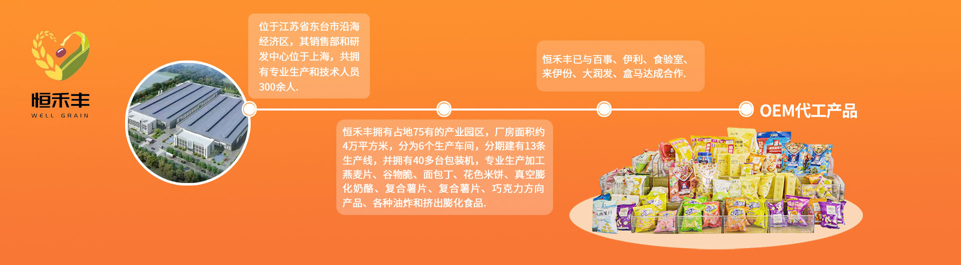 公司與國(guó)內(nèi)外多家知名企業(yè)開(kāi)始合作,產(chǎn)品的質(zhì)量與服務(wù)的態(tài)度得到了各企業(yè)的高度認(rèn)可和贊賞。東臺(tái)恒禾豐食品有限公司成立于2018年,廠區(qū)位于江蘇省東臺(tái)市沿海經(jīng)濟(jì)區(qū),其銷售部和研發(fā)中心位于上海,共擁有專業(yè)生產(chǎn)和技術(shù)人員300余人。作為一家集食品生產(chǎn)、加工、銷售為一體的OEM/ODM企業(yè),恒禾豐已與百事、伊利、食驗(yàn)室、薄荷健康、鯊魚(yú)菲特、來(lái)伊份等數(shù)個(gè)國(guó)內(nèi)外知名品牌合作。